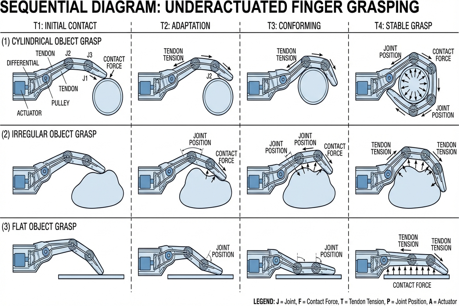 - Underactuation: Initial approach → passive adaptation to object shape