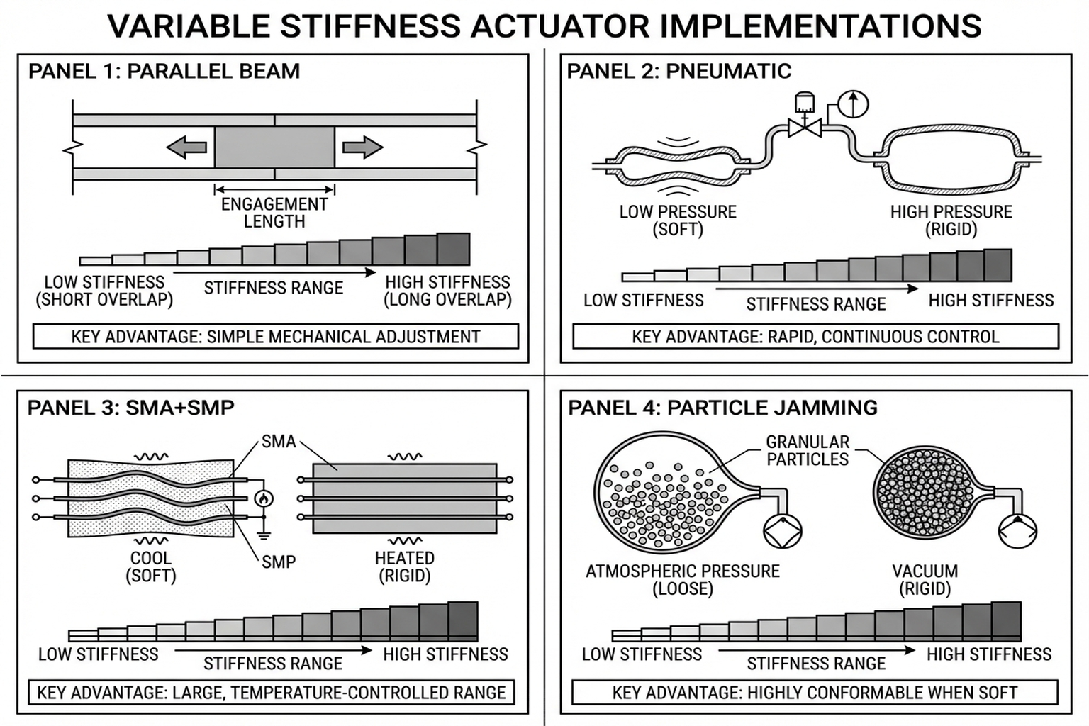 Variable stiffness actuators (VSAs) enable a single mechanism to transition between compliant and stiff states. Seminar 3 systematically organized four implementation approaches: