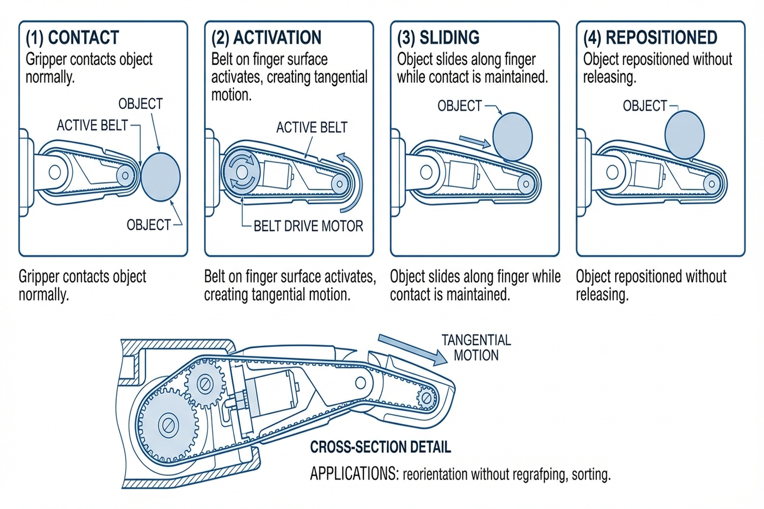 - Repositioning/alignment: Belt drives adjust object position within the grasp