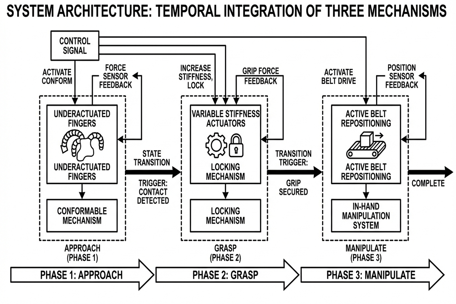 These three stages implement the natural flow of human grasping — "approach → grasp → adjust" — through mechanism.