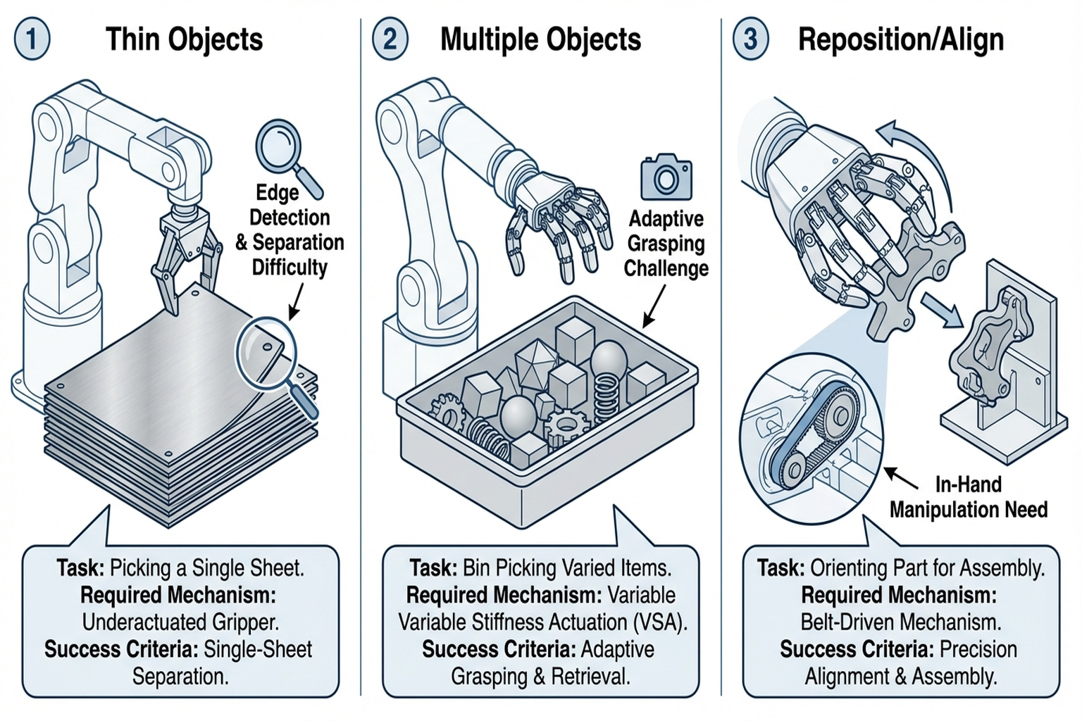 Extremely thin objects (cards, paper, gaskets) are difficult for parallel grippers. Active belt surfaces lift edges from the table, followed by underactuated finger grasping. PP-Tac[17] [#12] (R-Tac + Diffusion Policy, 87.5% success) attacks this problem from the tactile+learning direction; Seminar 3's mechanism approach attacks it from physical design (→ Chapter 7.3).