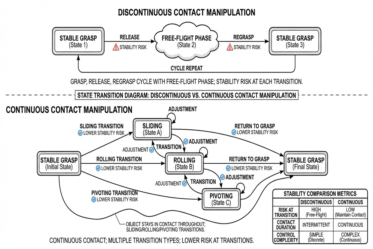 The key insight from Seminar 3: continuous contact is easier to control and more stable than discrete contact. It eliminates the uncertainty that arises from releasing and re-grasping.