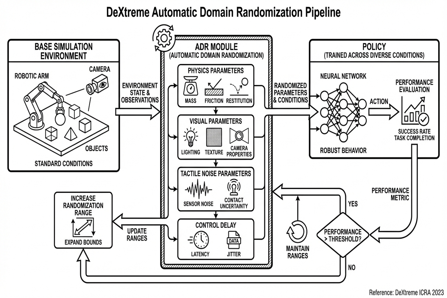 Key Paper: Handa, A., et al. (2023). "DeXtreme: Transfer of Agile In-hand Manipulation from Simulation to Reality." ICRA 2023. ADR with simultaneous physics/non-physics randomization is the key to sim-to-real dexterous manipulation.