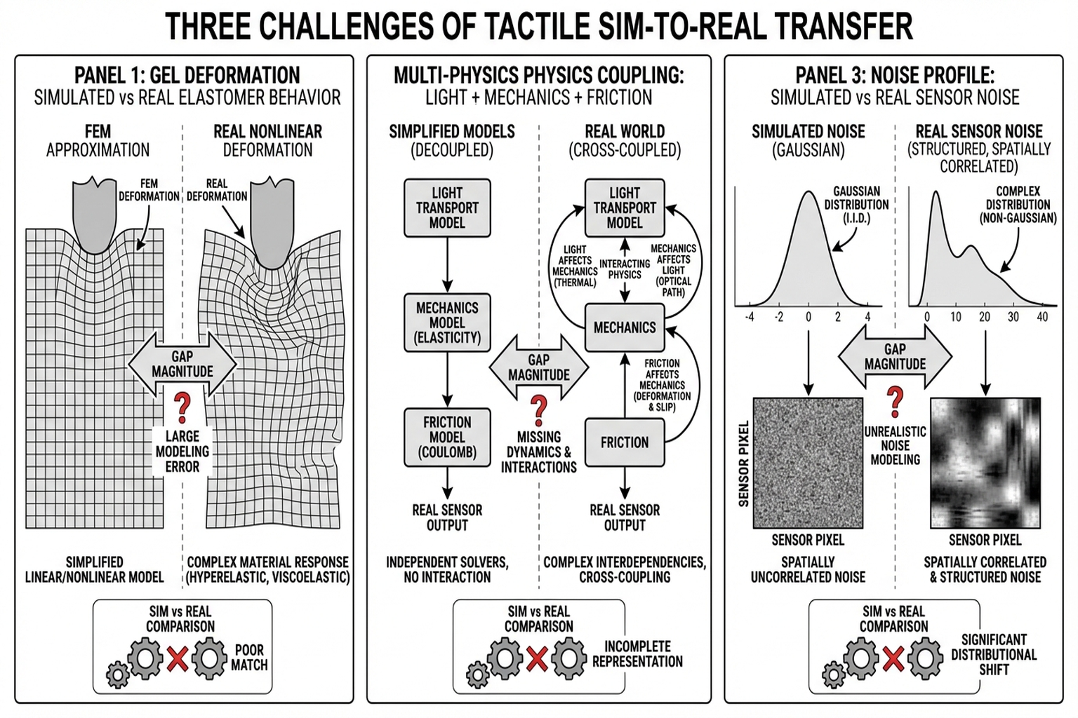 Tactile sim-to-real is fundamentally harder than visual sim-to-real: accurate gel deformation modeling is difficult; multi-physics coupling (optical + deformation + contact) is complex; sensor noise profiles differ between simulation and reality.