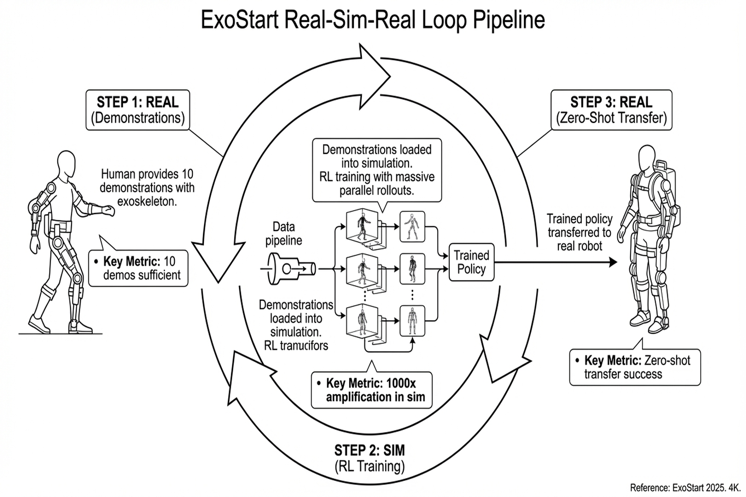 Key Paper: Si, Z., et al. (2025). "ExoStart: From 10 Exoskeleton Demos to Dexterous Robot Manipulation." 10 exoskeleton demos → dynamics filtering → auto-curriculum RL → zero-shot real. The exemplar of data-efficient Real-Sim-Real.