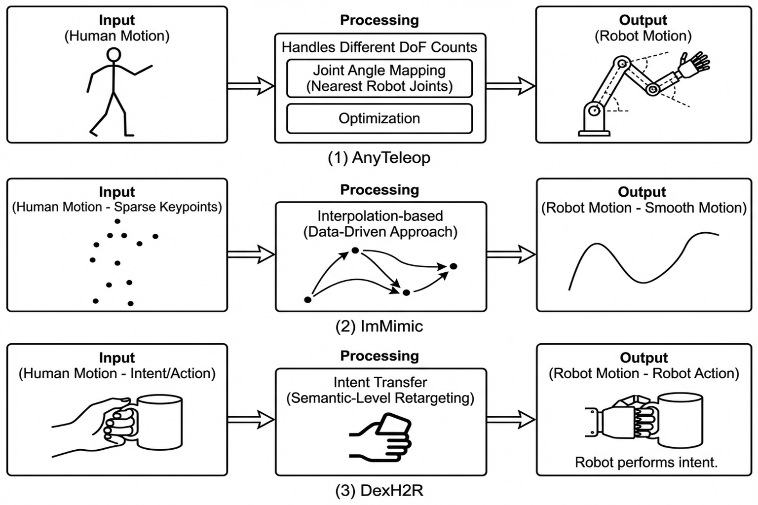 Qin et al. [2023, RSS] Dex-Retarget: human keypoints → robot joint positions. Limitation: naive mapping loses physical feasibility.
