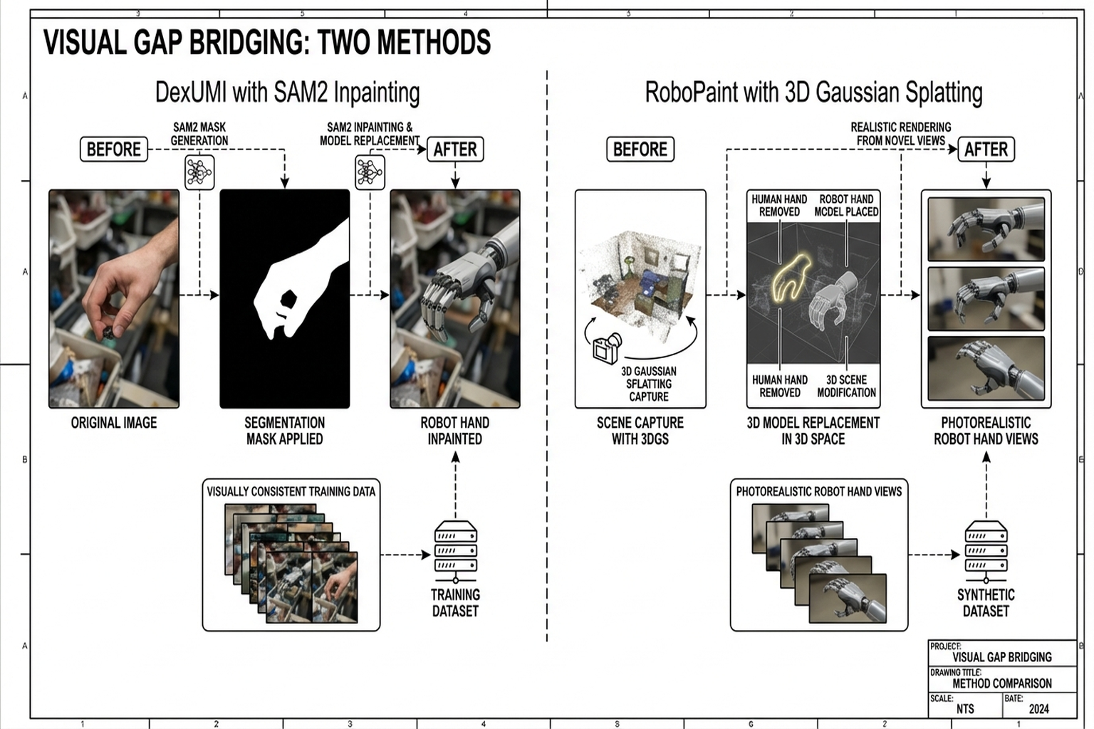 SAM2 inpainting: Erases human hand from camera images, replaces with robot hand. Visual policies become independent of human hand appearance. Kinematic gap resolved separately via exoskeleton.